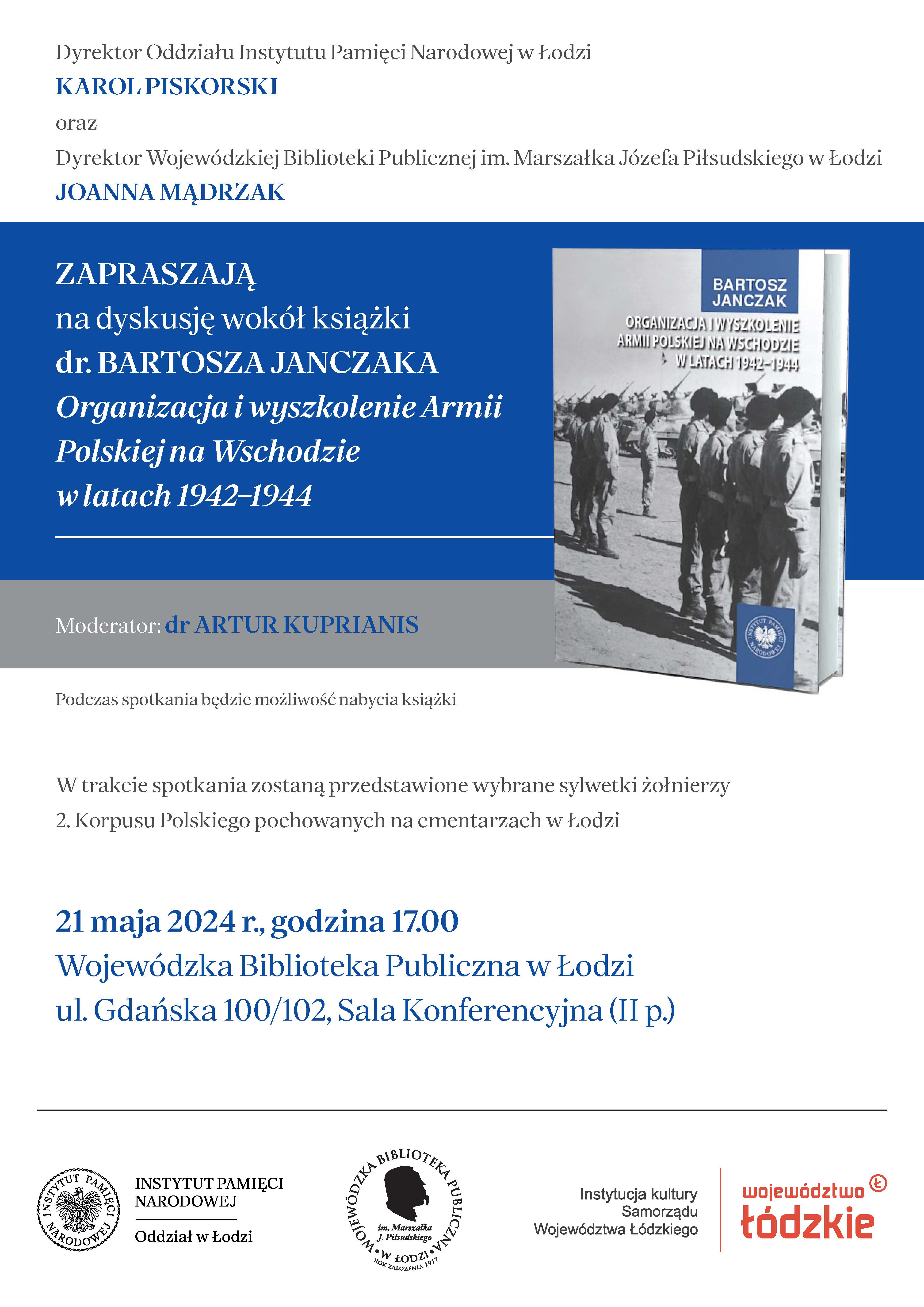 Dyrektor Oddziału Instytutu Pamięci Narodowej w Łodzi Karol Piskorski oraz Dyrektor Wojewódzkiej Biblioteki Publicznej im. Marszałka Józefa Piłsudskiego w Łodzi Joanna Mądrzak zapraszają na dyskusję wokół książki "Organizacja i wyszkolenie Armii Polskiej na Wschodzie w latach 1942–1944", która odbędzie się 21 maja 2024 r. o godz. 17.00 w Wojewódzkiej Bibliotece Publicznej w Łodzi (ul. Gdańska 100/102, Sala Konferencyjna (II p.)).