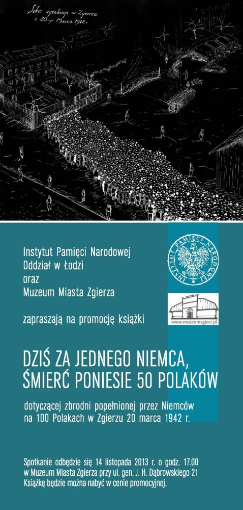 Oddział Instytutu Pamięci Narodowej w Łodzi oraz Muzeum Miasta Zgierza zorganizowały prezentację publikacji Oddziału IPN w Łodzi pt. „Dziś za jednego Niemca śmierć poniesie 50 Polaków". Materiały konferencji popularnonaukowej w Zgierzu, 20 III 2012 r. Publikacja dotyczy zbrodni popełnionej przez Niemców na 100 Polakach w Zgierzu 20 marca 1942 r.