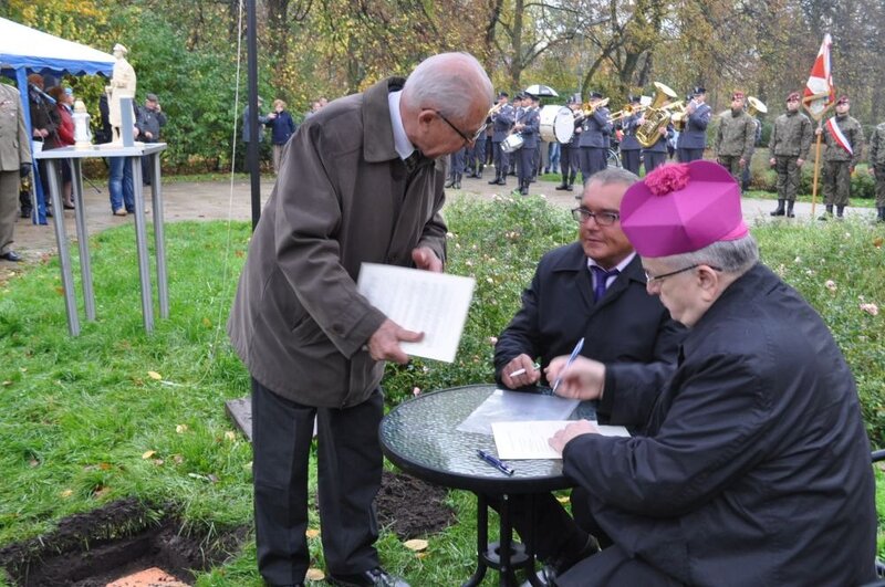 Kamień węgielny pod pomnik poświęcił, w obecności: Agnieszki Nowak – wiceprezydent Łodzi, Jolanty Chełmińskiej – Wojewody Łódzkiego, Marcina Bugajskiego – członka zarządu województwa oraz Marka Drużki – dyrektora łódzkiego oddziału IPN, a także reprezentantów instytucji państwowych, kombatantów i ich rodzin oraz młodzieży szkolnej, ksiądz biskup Adam Lepa.