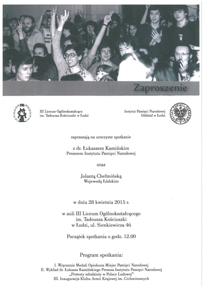 28 kwietnia 2015 r. w auli III Liceum Ogólnokształcącego im. Tadeusza Kościuszki w Łodzi odbyło się uroczyste spotkanie ambasadorów pamięci narodowej. Pobudkami do tak patriotycznego zgromadzenia były: wręczenie Medali Opiekuna Miejsc Pamięci Narodowej, wykład prezesa Instytutu Pamięci Narodowej – dr. Łukasza Kamińskiego na temat protestów młodzieży w Polsce Ludowej oraz inauguracja Klubu Armii Krajowej im. Cichociemnych przy III LO w Łodzi.