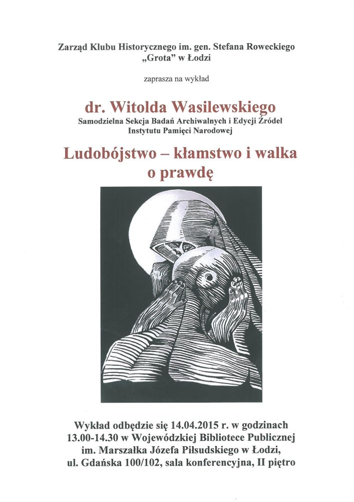 Na spotkaniu Klubu Historycznego im. gen. Stefana Roweckiego „Grota” w Łodzi, które odbędzie się 14 kwietnia 2015 r. (wtorek), z wykładem pt. „Ludobójstwo – kłamstwo i walka o prawdę” wystąpi dr Wasilewski z IPN w Warszawie.