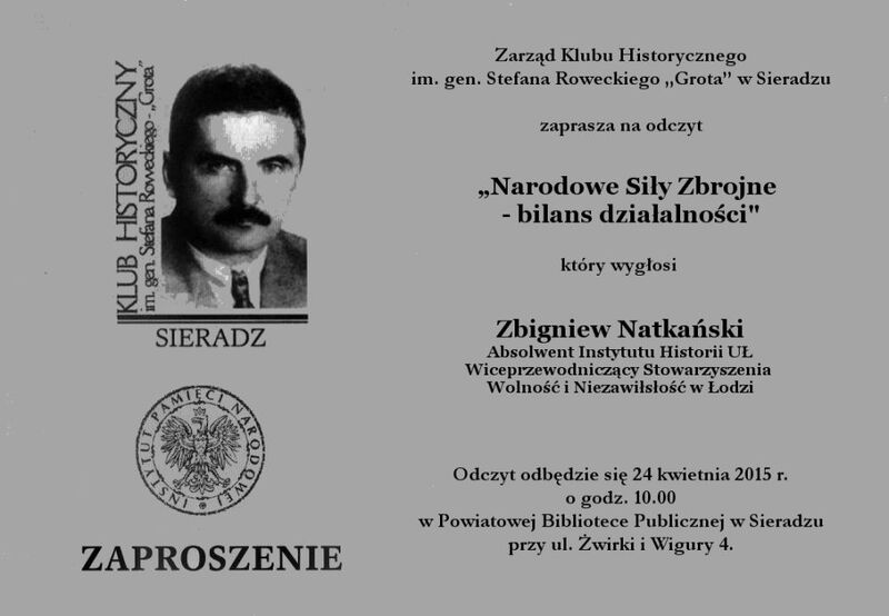 Instytut Pamięci Narodowej Oddział w Łodzi oraz Zarząd Klubu Historycznego im. gen. Stefana Roweckiego „Grota” w Sieradzu zapraszają na wykład Zbigniewa Natkańskiego, absolwenta Instytutu Historii UŁ, wiceprzewodniczącego Stowarzyszenia WiN w Łodzi, pt. „Narodowe Siły Zbrojne – bilans działalności”.