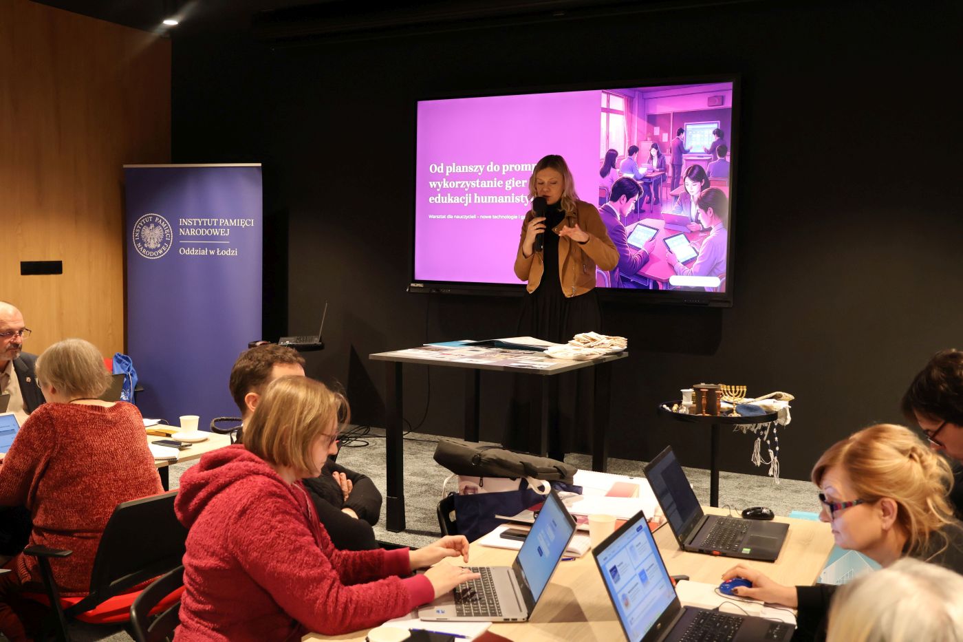 W części warsztatowej Beata Grzelka (Centrum Doskonalenia Nauczycieli w Koninie) zaprezentowała sposób uatrakcyjnienia lekcji historii poprzez wykorzystanie aplikacji AI do tworzenia materiałów wizualnych oraz zapoznała uczestników z grą towarzyską „Drejdel” przydatną do realizacji zagadnienia kultury i tradycji Żydów polskich w II RP podczas zajęć szkolnych.
