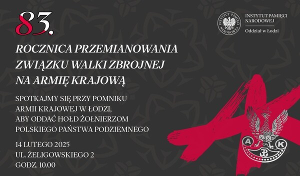 14/02/2025Narodowy Dzień Pamięci Żołnierzy Armii Krajowej - 83. Rocznica przemianowania Związku Walki Zbrojnej na Armię Krajową - Łódź, 14.02.2024 r.